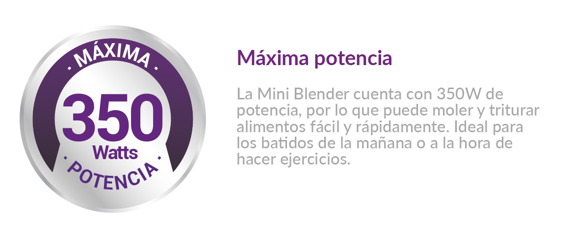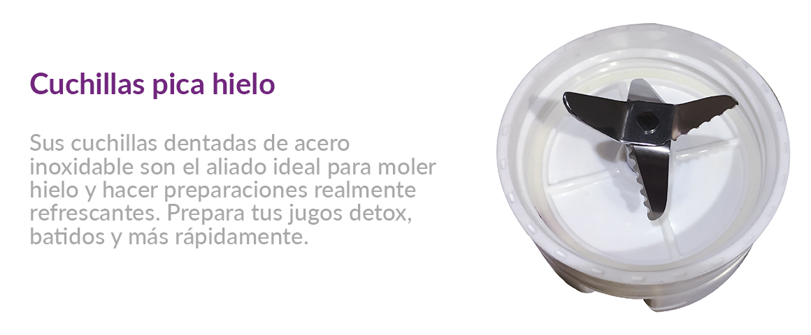 350W potencial. Vaso 600cc y 300cc de tritán, libres de BPA. Cuchillas pica Hielo.