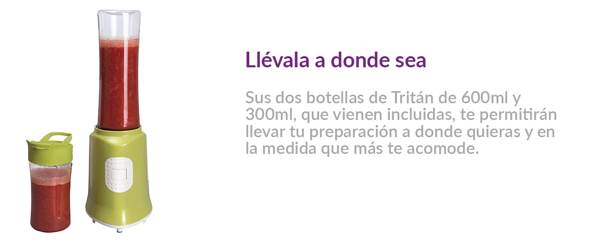 • Incluye 2 prácticas botellas con tapa, de 300cc y 600cc para que puedas llevar tu preparación donde quieras.